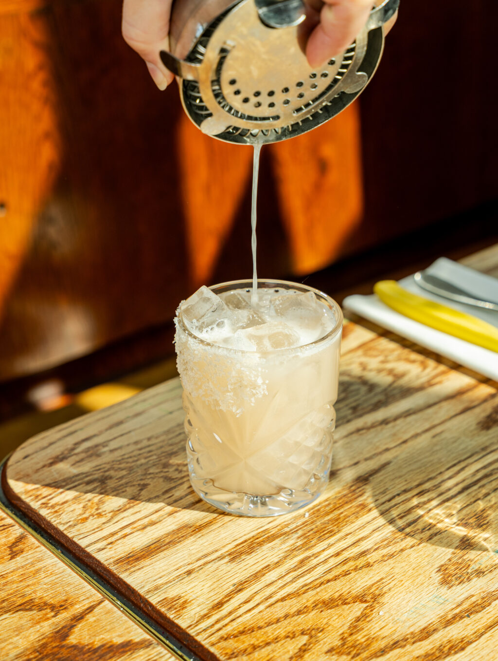 - Double-filtrer à l'aide de la passoire fine dans le verre givré rempli de glaçons.